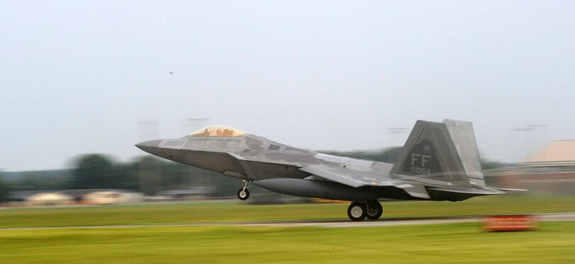 LANGLEY AIR FORCE BASE, Va. -- An F-22A Raptor lands during a Phase I Operational Readiness Exercise here Aug. 28. The ORE is designed to establish Langley's expeditionary readiness and efficiency in deploying Airman. More than 2,500 Airman will be involved in the exercise, which will measure the 1st Fighter Wing's capabilities on graded step-by-step guidelines which involve preparing aircraft, cargo and Airman to deploy seamlessly within an established period of time. (U.S. Air Force photo/Senior Airman Zachary Wolf)