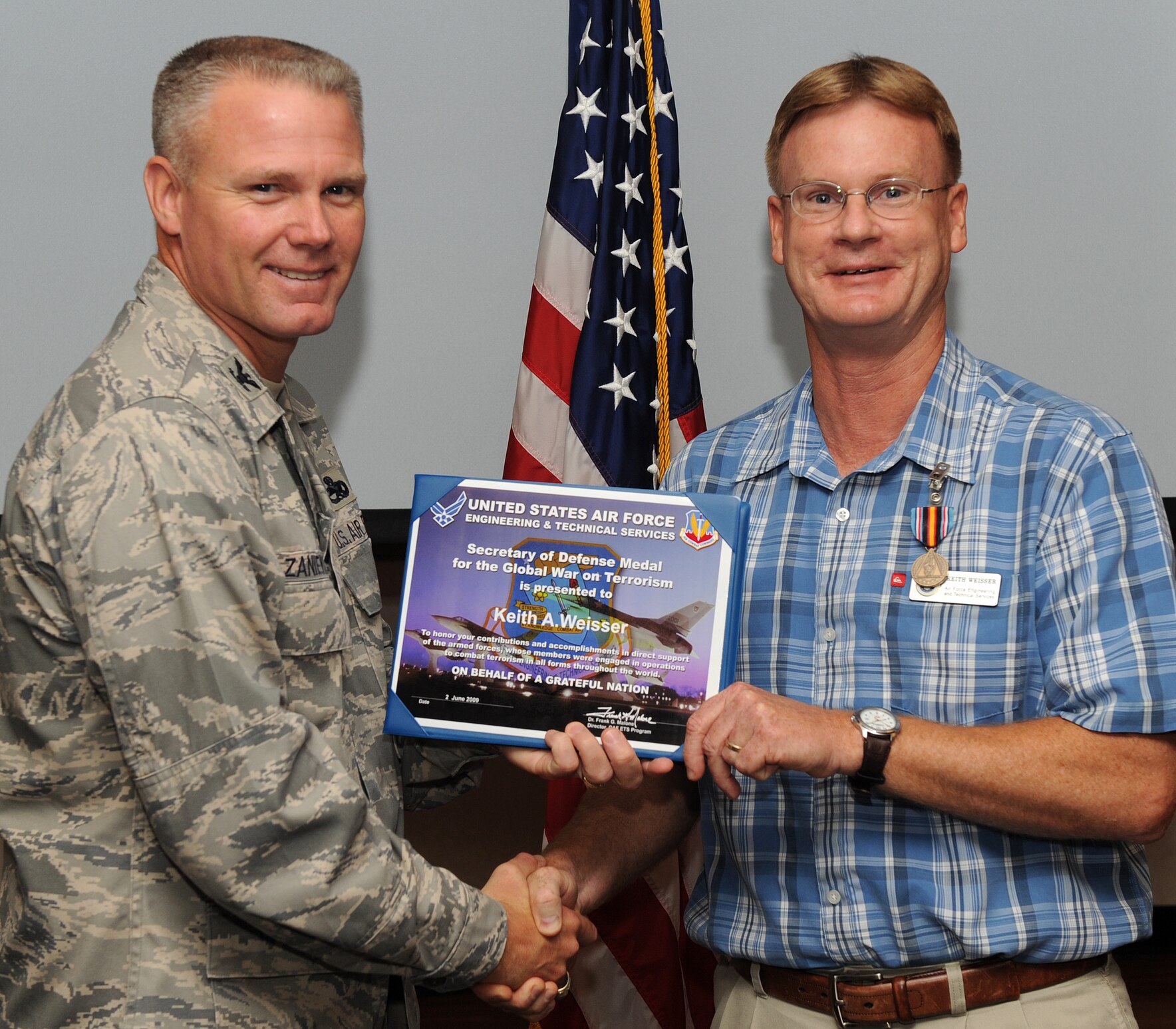 LANGLEY AIR FORCE BASE, Va. -- Col. Geroge A. Zaniewski, 1st Maintenance Group commander, presents the Secretary of Defense Civilian Global War on Terrorism Service Medal certificate to Mr. Keith Weisser, 1st MXG engineering and technical services avionic lead, here Aug. 14. Mr. Weisser was awarded this medal for avionic support while deployed from December 2001 to March 2002. (U.S. Air Force photo/Senior Airman Zachary Wolf)