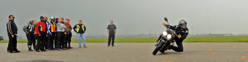 LANGLEY AIR FORCE BASE, Va. -- Lee Parks, Total Control Advanced Riding Clinic chief instructor, demonstrates the proper technique for taking a sharp turn, to his class here Aug. 7. Mr. Parks runs the Total Control Advanced Riding Clinic to teach riders how to keep control of their vehicle even in the worst of circumstances. (U.S. Air Force photo/Airman 1st Class Jonathan Koob)