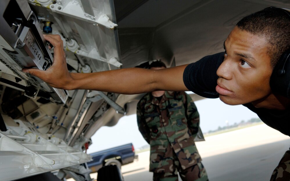 Airman 1st Class Lamond Janey inspects a missile launcher on an F-22 Raptor during a weapons load inspection at Langley Air Force Base, Va., on Aug. 15. Airman Janey is a weapons load crew member with the 27th Aircraft Maintenance Unit. (U.S. Air Force photo/Staff Sgt. Samuel Rogers)