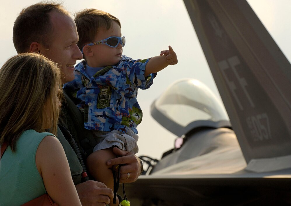 Capt. Daniel Lee shares a moment with his son, Benton, and wife, Rebecca, after arriving at Naval Air Station Oceana, Va., on Friday, June 30. The 27th Fighter Squadron, along with the 71st and 94th FS from Langley Air Force Base, Va., are flying sorties from other installations because of runway repairs at their home station. Captain Lee, who just returned from Elmendorf AFB, Alaska, is an F-22 Raptor pilot assigned to the 27th FS. (U.S. Air Force photo/Staff Sgt. Samuel Rogers)