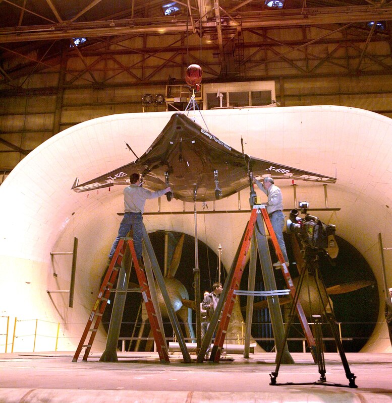 LANGLEY AIR FORCE BASE, Va.— Boeing, NASA and Cranfield Aerospace technicians complete installation of the first X-48B research aircraft at the Langley Full-Scale Tunnel. The test vehicle successfully completed 250 hours of wind tunnel testing in mid-May. (Courtesy photo)