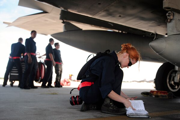 LANGLEY AIR FORCE BASE, Va. -- Airman 1st Class Jessica Hinves, 71st Fighter Squadron crew chief, reviews an F-15 technical order book during a Phase I Operational Readiness Exercise here June 12. The Phase I ORE was conducted to test and prepare Airmen for future deployments. (U.S. Air Force photo/Senior Airman Vernon Young)