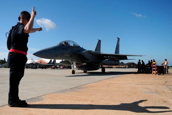LANGLEY AIR FORCE BASE, Va. -- Senior Airman Max Ziegenhagen, 71st Fighter Squadron crew chief, marshals an F-15C onto the runway during a Phase I Operational Readiness Exercise here June 12. The Phase I ORE was conducted to test and prepare Langley Airmen for future deployments. (U.S. Air Force photo/Senior Airman Vernon Young)