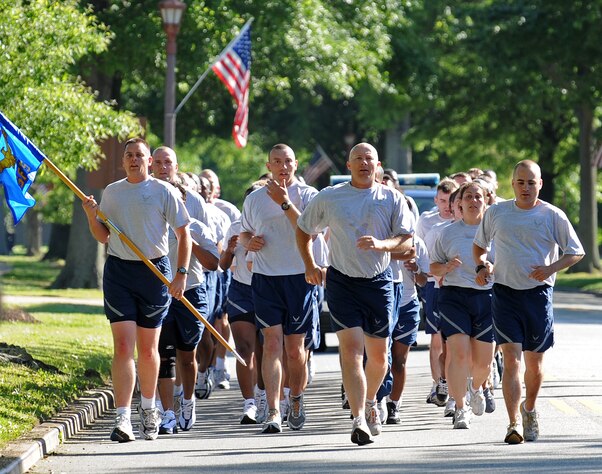 LANGLEY AIR FORCE BASE, Va. -- Members of the 1st Security Forces Squadron run down Dodd Boulevard May 21. This was one of the runs SF completes annually. (U.S. Air Force photo/Senior Airman Zachary Wolf)