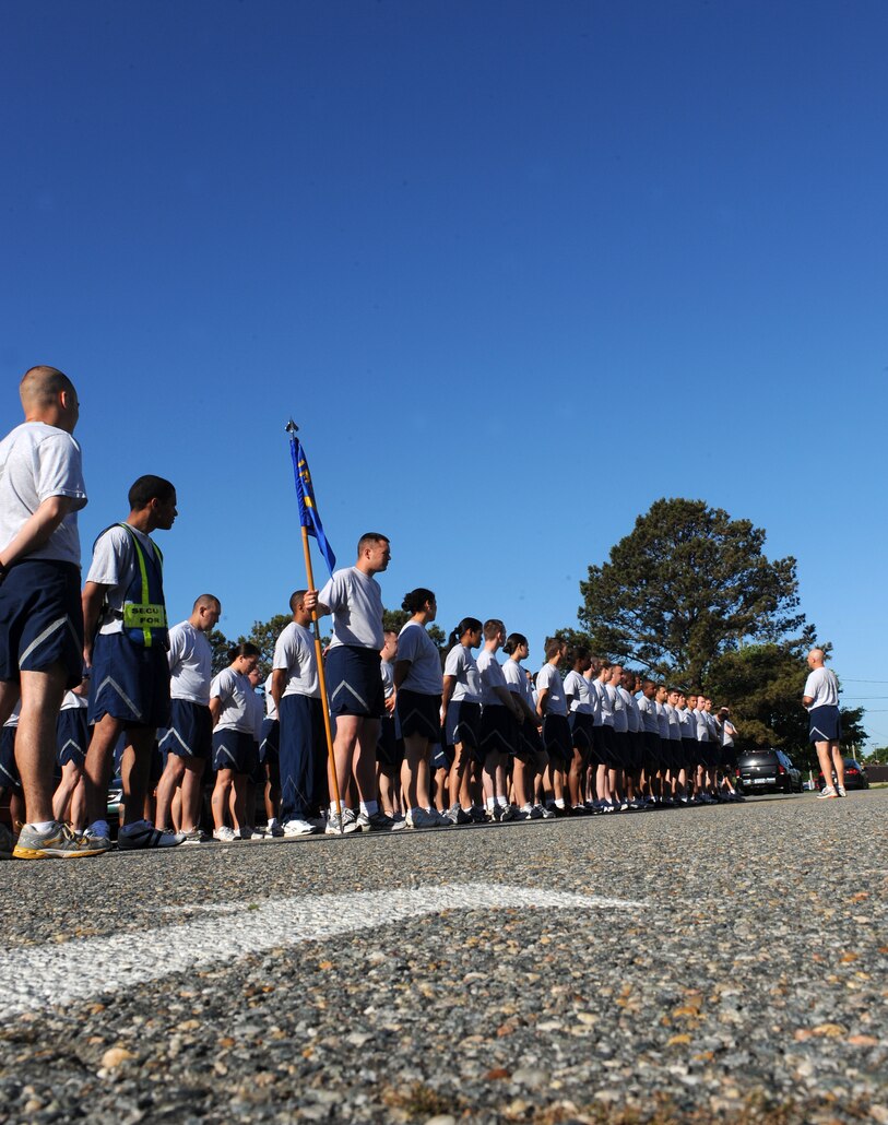 LANGLEY AIR FORCE BASE, Va. -- Lt. Col. William Brooks, 1st Security Forces Squadron commander, gives a safety briefing to his squadron before their run May 21. This briefing was used to help ensure the Airmen stay safe during the run and during the Memorial Day weekend. (U.S. Air Force photo/Senior Airman Zachary Wolf)