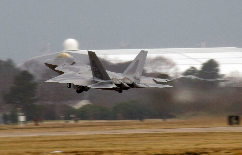 LANGLEY AIR FORCE BASE, Va. (AFPN) -- An F-22A Raptor takes off from Langley Air Force Base Jan. 21 during an Operation Noble Eagle mission. This historical event marks the first time the F-22A Raptor is participating in the joint services operation to protect American soil. The Raptor is piloted by Lt. Col. James Hecker, the 27th Fighter Squadron commander. (U.S. Air Force photo by Staff Sgt. Samuel Rogers)