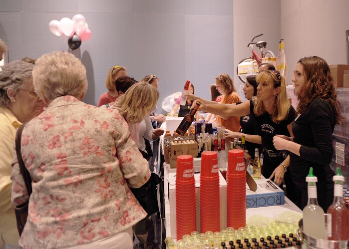 LANGLEY AIR FORCE BASE, Va. -- Volunteers hand out beverages at the Hampton Roads Convention Center May 15 at "A Night Under The Stars." The event, organized for wives of military members, housed all kinds of freebies to include massages, a live band and beverages. (U.S. Air Force photo/Airman 1st Class Jonathan Koob)