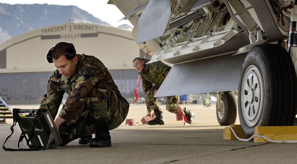 HILL AIR FORCE BASE, Utah -- Staff Sgt. Jason McDonald (left), a weapons load crew chief, checks his technical orders after loading two joint direct attack munitions onto an F/A-22 Raptor. The sergeant and the Raptors, from the 27th Fighter Squadron at Langley Air Force Base, Va., deployed here to take part in exercise Combat Hammer. The jets have a twofold goal: complete a deployment and to generate a combat-effective sortie rate away while deployed. (U.S. Air Force photo by Staff Sgt. Samuel Rogers)