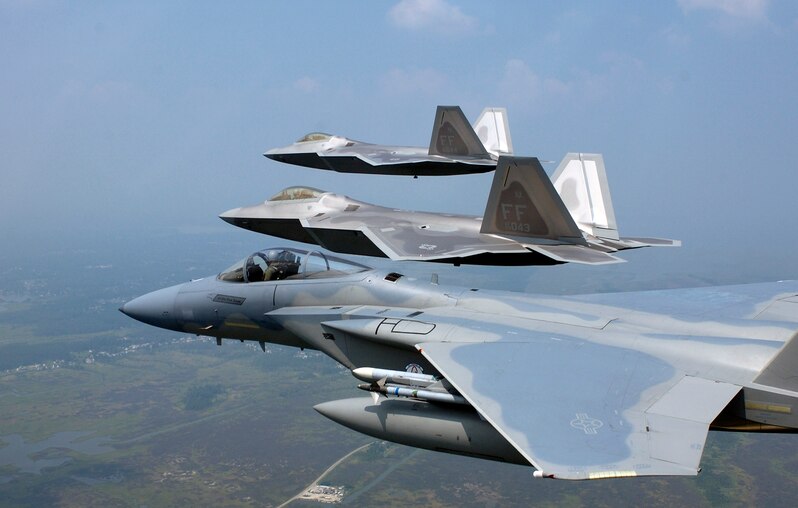 LANGLEY AIR FORCE BASE, Va. -- Two F/A-22 Raptors and a F-15 Eagle fly in formation during a training sortie here. The 27th Fighter Squadron currently has five permanently assigned Raptors. (U.S. Air Force photo by Tech. Sgt. Ben Bloker)