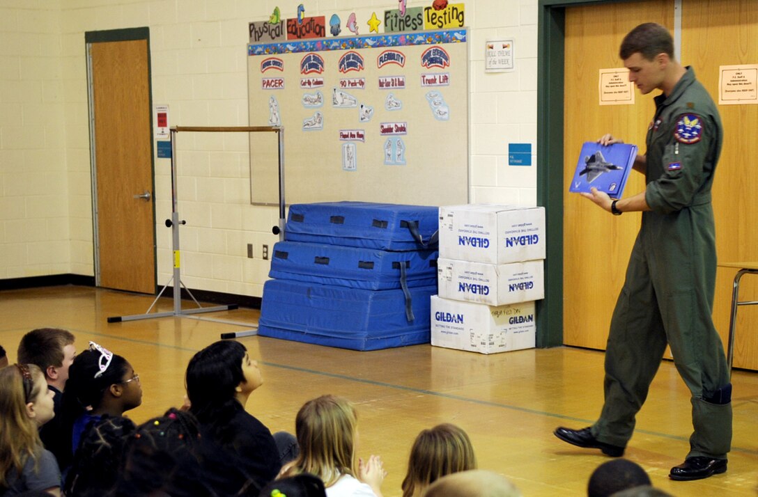 LANGLEY AIR FORCE BASE, Va. -- Maj. Dave "Zeke" Skalicky, F-22A Raptor Demonstration Team pilot, speaks to third graders at Thalia Elementary School about the F-22 April 22. The F-22 Demonstration Team visited schools throughout the local community as a part of Hampton Roads Air Force Week activities. This week is a chance to tell their Air Force story, showcase warfighting capabilities and thank the community for their support. (U.S. Air Force photo/Staff Sgt. Tabitha Kuykendall)