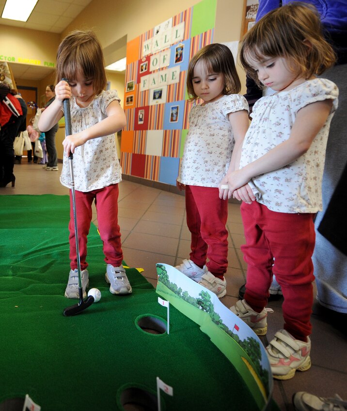 LANGLEY AIR FORCE BASE, Va.-- Identical triplets, daughters of Lt. Col. Richard Basak, Air Combat Command Operations Directorate, play a game of putt-putt during Spring Fling events at the Shellbank Youth Center March 23. The Spring Fling was a day of fun and games for the families of deployed Airmen. (U.S. Air Force photo/Airman Rebecca Montez)