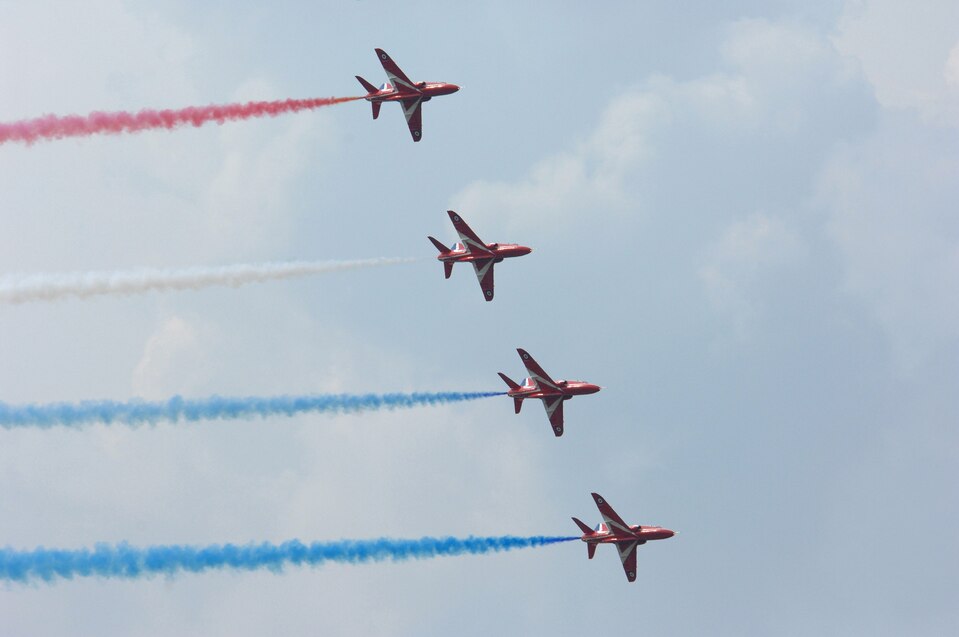 LANGLEY AIR FORCE BASE, Va. – The Royal Air Force Red Arrows Hawk T1s fly in formation at AirPower over Hampton Roads June 22. Langley’s open house is an annual event that helps educate the public, increase recruiting and show appreciation to the local community. (U.S. Air Force photo/Tech. Sgt. April Wickes)
