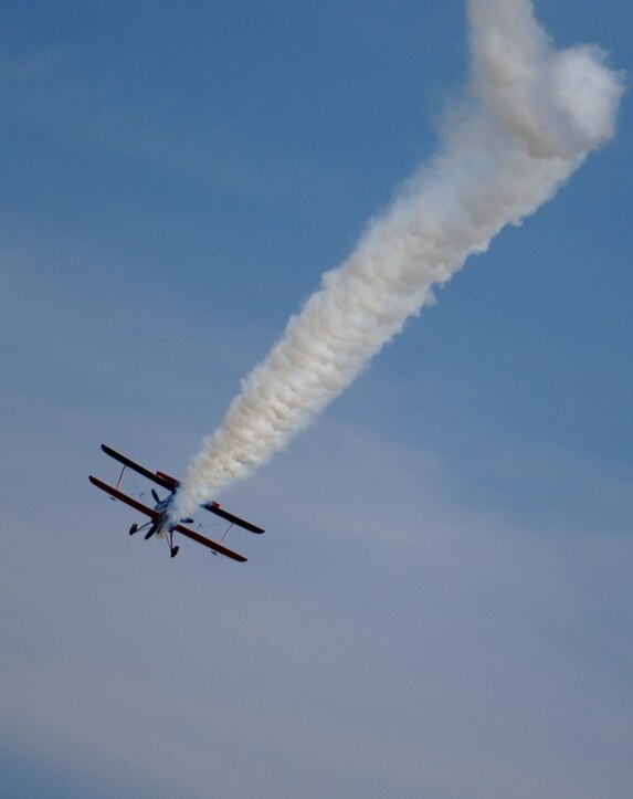 LANGLEY AIR FORCE BASE, Va. -- Ed Hamill flies an Air Force Reserve biplane during AirPower over Hampton Roads here June 21. Langley’s open house is an annual event that helps educate the public, increase recruiting and show appreciation to the local community. “It's a chance to get people informed, involved and excited,” said Lt. Col. Brady Merrill, director of AirPower over Hampton Roads and chief of 1st Fighter Wing Plans, Programs and Evaluations. (U.S. Air Force photo/Tech.Sgt. Levi Collins)