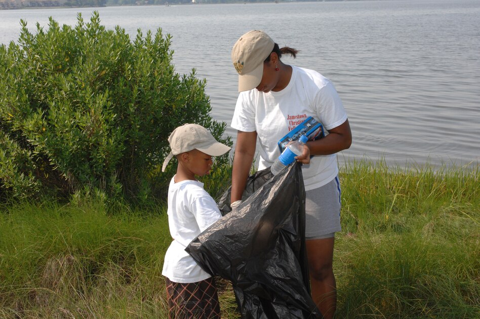 LANGLEY AIR FORCE BASE, Va. -- Isaiah McLaughlin and his mother Staff Sgt. Danielle McLaughlin, Headquarters Air Combat Command, conference center technician, work together to pick up trash during Langley’s 20th annual Clean the Bay Day June 7. Sergeant McLaughlin and her son were part of 187 volunteers that collected1.25 tons of trash. (U.S. Air Force photo/ Tech. Sgt. April Wickes)