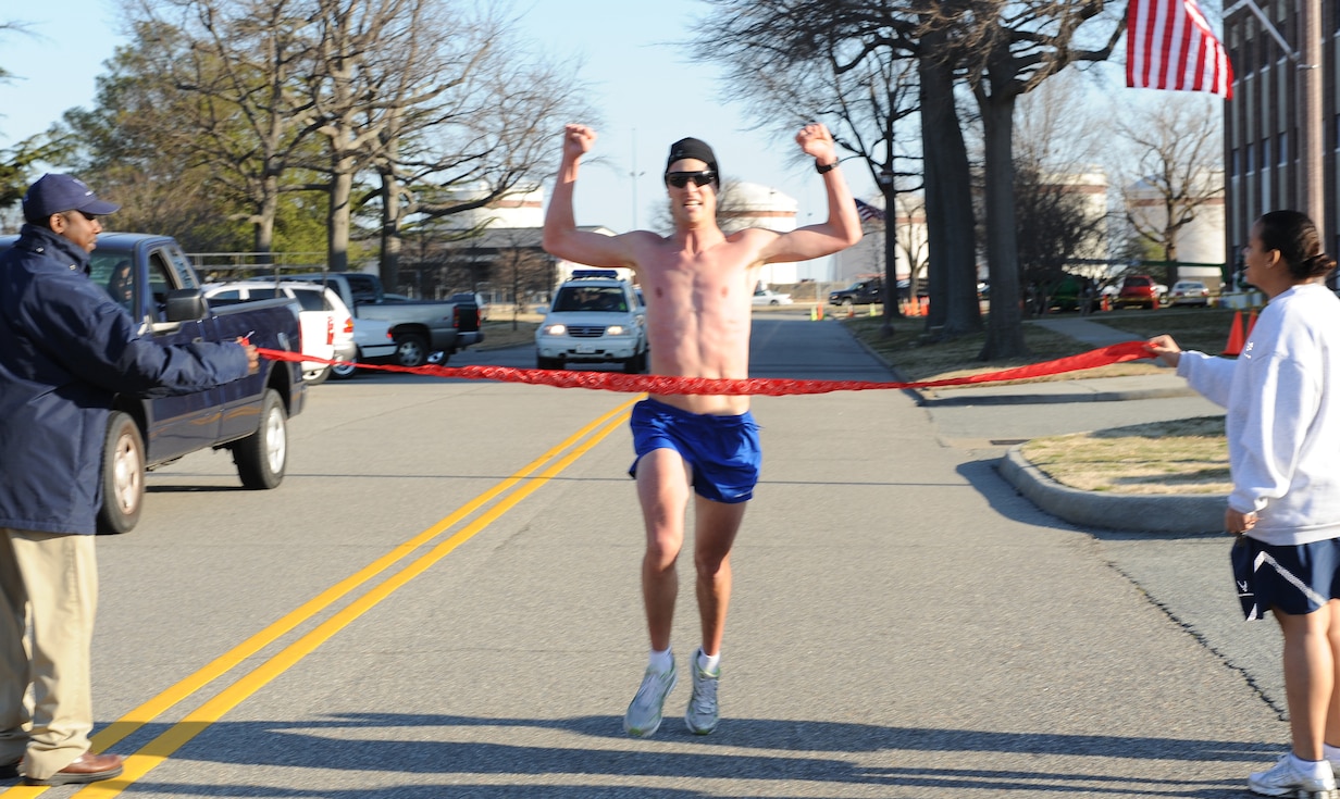 LANGLEY AIR FORCE BASE, Va. – Maj. Robert Schabron, 1st Force Support Squadron manpower personnel flight commander comes in first place at the Valentines Day 10K run here Feb 13. The 1st Force Support squadron hosted a 10K to boost morale for the volunteers (U.S. Air Force photo/Airman 1st Class Gul Crockett