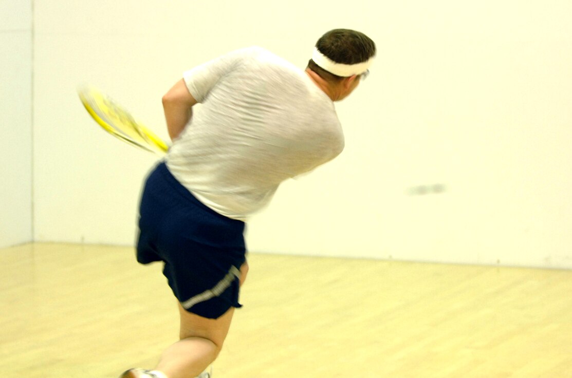 LANGLEY AIR FORCE BASE, Va. -- Dennis Simpson from Air Combat Command Communications practices racquet ball after winning the intramural championships against Air Combat Command Operations March 28. Col. Simpson is now preparing to play for the Air Force racquet ball team.(U.S. Air Force photo/Senior Airman Christopher L. Ingersoll)