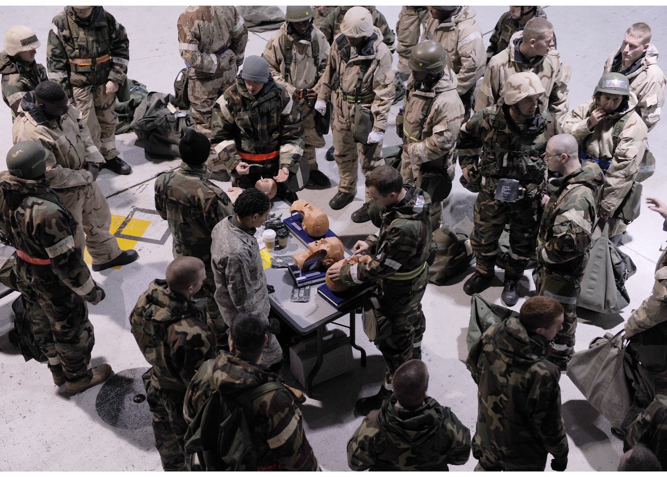 LANGLEY AIR FORCE BASE, Va. -- Airmen watch self aid and buddy care instructors administer a breathing apparatus to a mannequin during an Ability to Survive and Operate Rodeo Feb. 4. The Rodeo provided training to more than 700 Airmen to prepare them for deployment. (U.S. Air Force photo / Airman 1st Class Jonathan Koob)