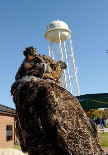 LANGLEY AIR FORCE BASE, Va.-- A great horned owl, part of the Virginia Living Museum's traveling display, poses in front of the child development center Oct. 31. The Museum brought fur, fossils, stones, and bones for the children to enjoy. (U.S. Air Force photo/Airman Rebecca Montez)