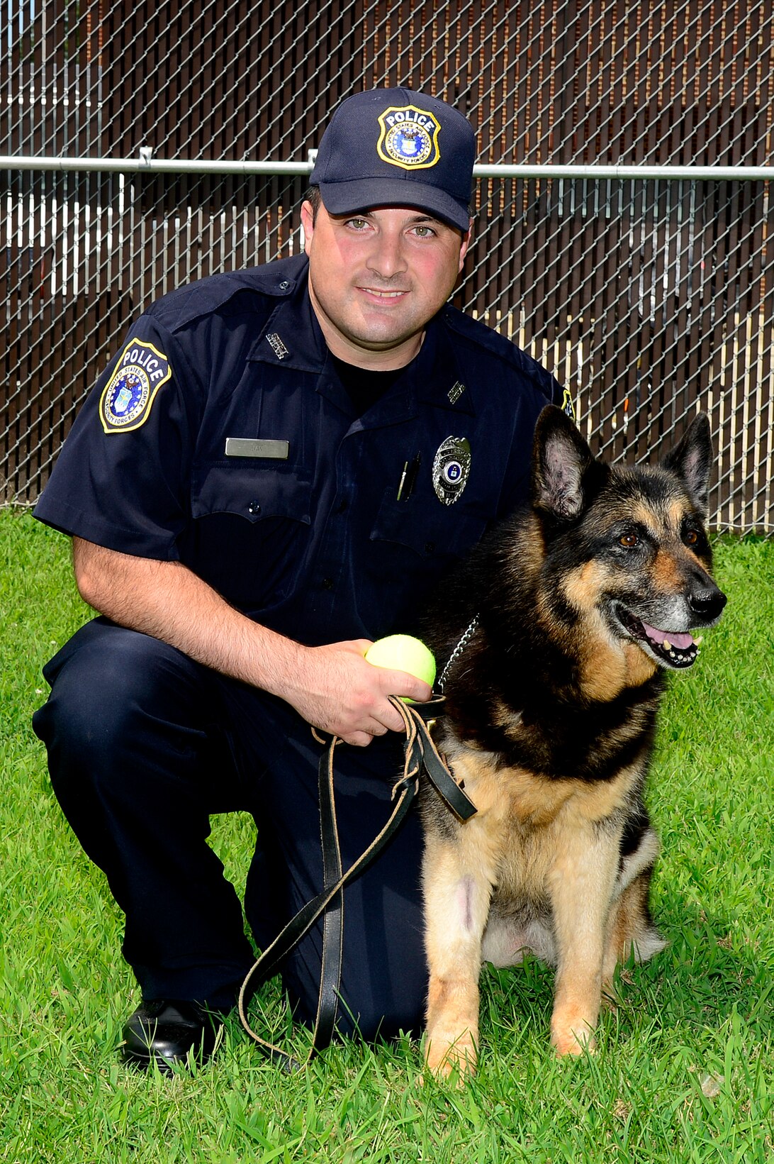 George Jay, 733rd Security Forces Squadron lieutenant, poses for a picture with Otta, a 12-year-old German Shepard patrol explosive detector dog he recently adopted at Fort Eustis, Va., June 26, 2014. Jay and Otta deployed as an explosive dog team to Afghanistan between 2011 and 2012. (U.S. Air Force photo by Senior Airman Kayla Newman/Released)