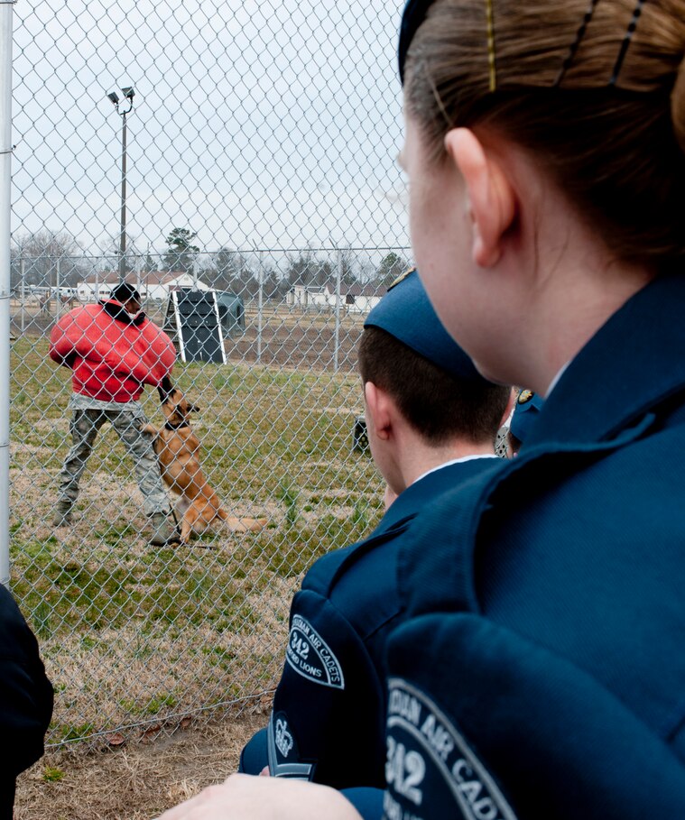 Royal Canadian Air Cadets from the 342nd Bedford Lions Squadron watch a U.S. military working dog demonstration at the 633rd Security Force Squadron during a tour of Langley Air Force Base, Va., March 12, 2014. The 342nd Bedford Lions Squadron cadets visited the 633rd Logistics Readiness Squadron, 633rd Security Forces Squadron, Shellbank Fitness Center and finished the visit with a meal at the Crossbow dining facility. (U.S. Air Force photo by Airman 1st Class R. Alex Durbin/Released)