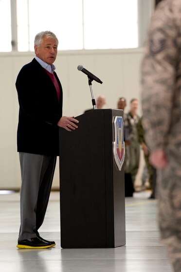 Defense Secretary Chuck Hagel speaks with Airmen chosen as top performers during a town hall meeting at Langley Air Force Base, Va., Feb. 25, 2014. Hagel spoke about proposed cuts in military spending, to include further reductions in troop strength and force structure in every military service in the coming year as part of an effort to prioritize U.S. strategic interests in the face of reduced resources after more than a decade of war. (U.S. Air Force photo by Staff Sgt. Stephanie R. Plichta/Released)