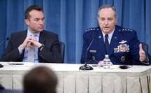Acting Secretary of the Air Force Eric K. Fanning and U.S. Air Force Chief of Staff Gen. Mark A. Welsh III present the "State of the Air Force," during a Pentagon press briefing Dec. 13, 2013. During the briefing, Fanning and Welsh addressed current Air Force challenges, to include sequestration's impacts to readiness, modernization and force structure, and their efforts to plan for a credible capable force over the next 10 years. (U.S. Air Force photo/Scott M. Ash)