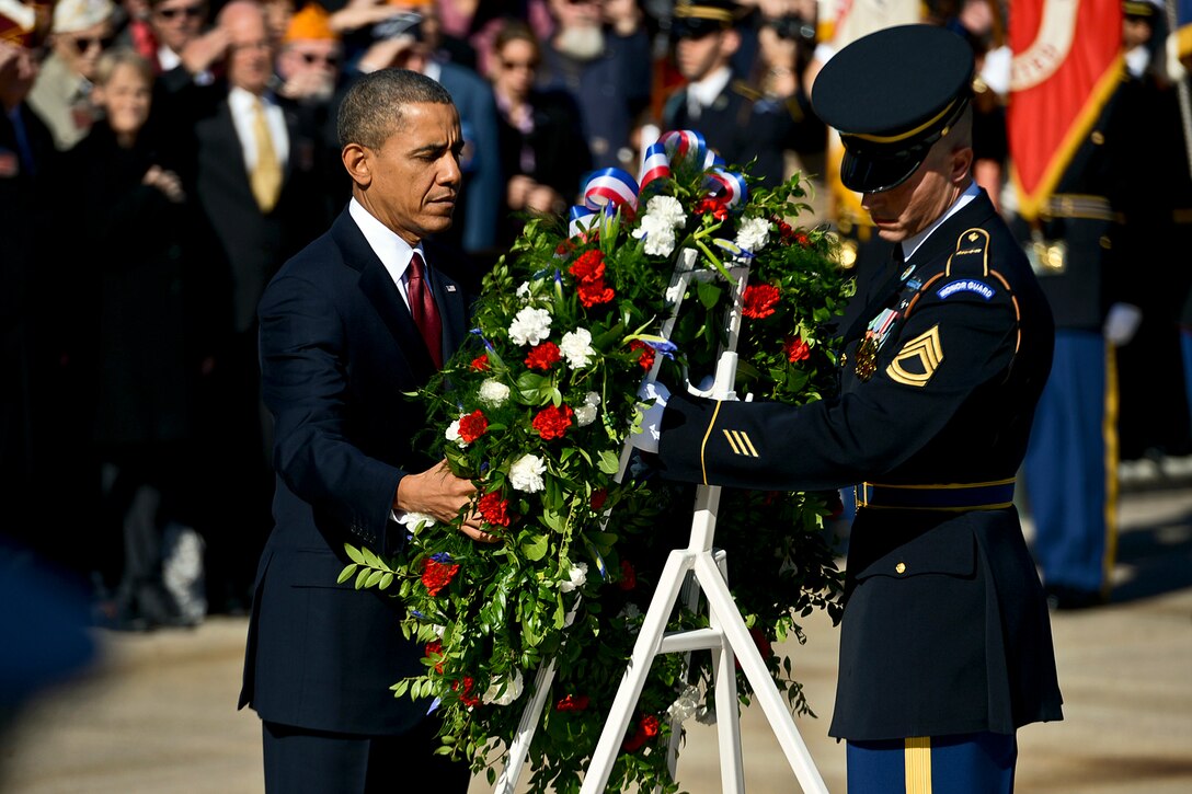 President Barack Obama places a wreath at the Tomb of the Unknowns with the help of an honor guard Soldier during a Veterans Day ceremony at Arlington National Cemetery in Arlington, Va., Nov. 11, 2013. (DOD photo by EJ Hersom/Released)