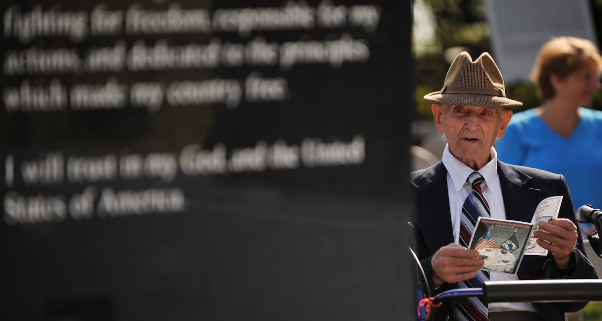 Retired U.S. Air Force Chief Master Sgt. Alcide Benini, World War II veteran and Bataan Death March survivor, glances up from reading the program for the 2013 POW/MIA Recognition Day ceremony on Langley Air Force Base, Va., Sept. 20, 2013. Benini was captured April 7, 1942 and spent 40 months as a Japanese POW. (U.S. Air Force photo by Staff Sgt. Jarad A. Denton/Released)