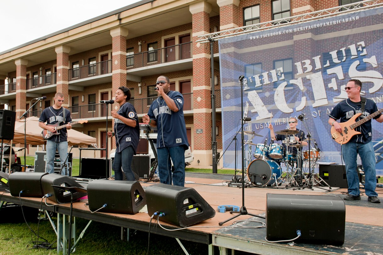 The U.S. Air Force band, Blue Aces, performs during the “We Are Family” campaign reunion at Langley Air Force Base, Va., Aug. 16, 2013. The campaign focused on the wingman concept, providing awareness for sexual assault prevention. (U.S. Air Force photo by Staff Sgt. Stephanie Rubi/Released)