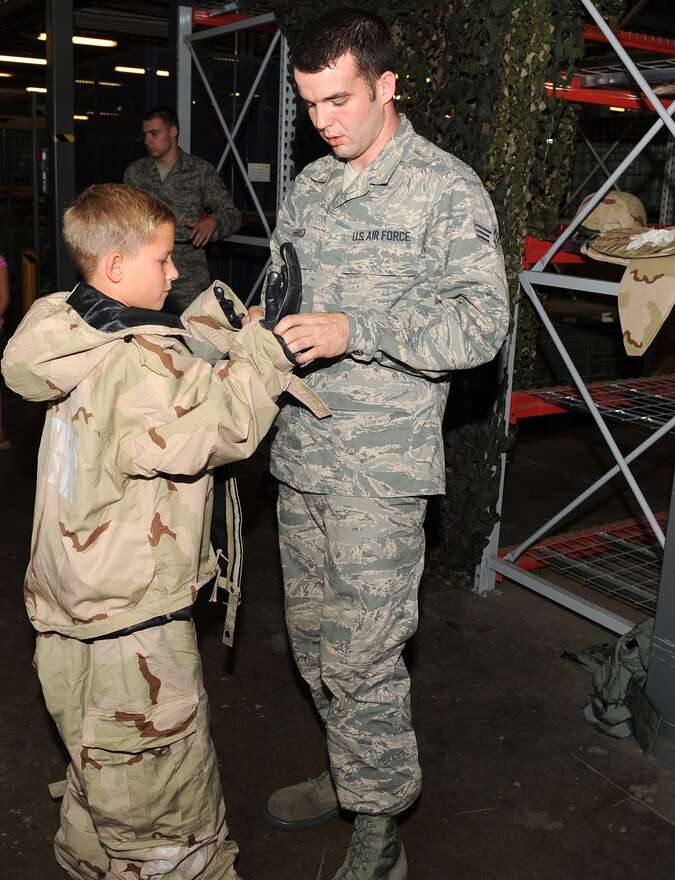 U.S. Air Force Senior Airman Jonathan Hood, 633rd Logisitics Readiness Squadron individuial protective equipment journeyman, dresses Derek Percivalle in protective gear during Operation Hero at Langley Air Force Base, Va., Aug. 7, 2013. Hood was one of many volunteers who helped children see the aspects of deployment requirements a Service member might encounter. (U.S. Air Force photo by Senior Airman Brittany Paerschke-O’Brien/Released)