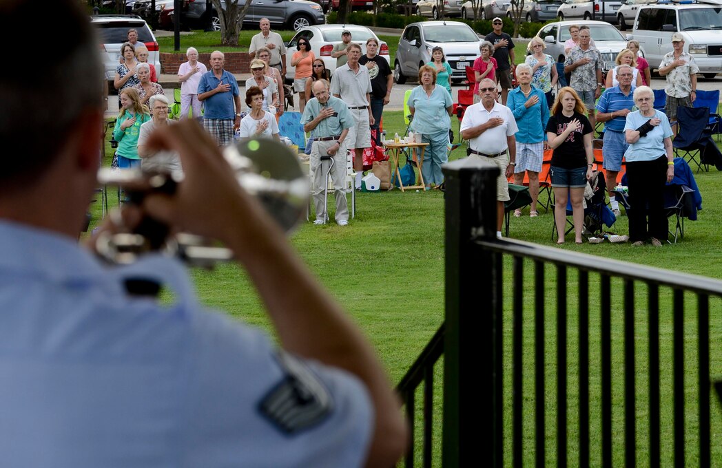Spectators cover their hearts during the U.S. Air Force Heritage of America Band Heritage Brass Quintet’s rendition of the national anthem at Fort Monroe, Va., Aug. 8, 2013. The Airmen played in support of Fort Monroe’s second annual Music by the Bay concert series, which features several regional military bands each Thursday evening through August. (U.S. Air Force photo by Airman 1st Class R. Alex Durbin/Released)