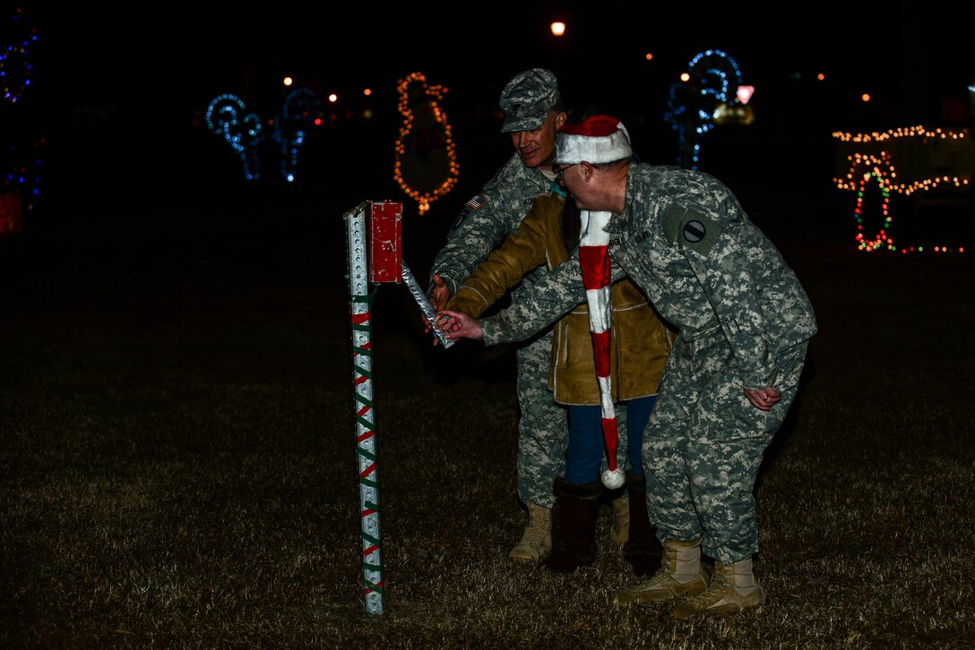 U.S. Army Maj. Gen. Ross Ridge, U.S. Army Initial Military Training Center of Excellence deputy commanding general, and Col. William Galbraith, 733rd Mission Support Group commander, joins Grace Hong, daughter of Army Sgt. David Hong, Fort Eustis chaplain assistant, as they light the Christmas tree at Fort Eustis, Va., Dec. 5, 2014. The 59th tree lighting ceremony was held at Seay Plaza. (U.S. Air Force photo by Senior Airman Kimberly Nagle/Released)