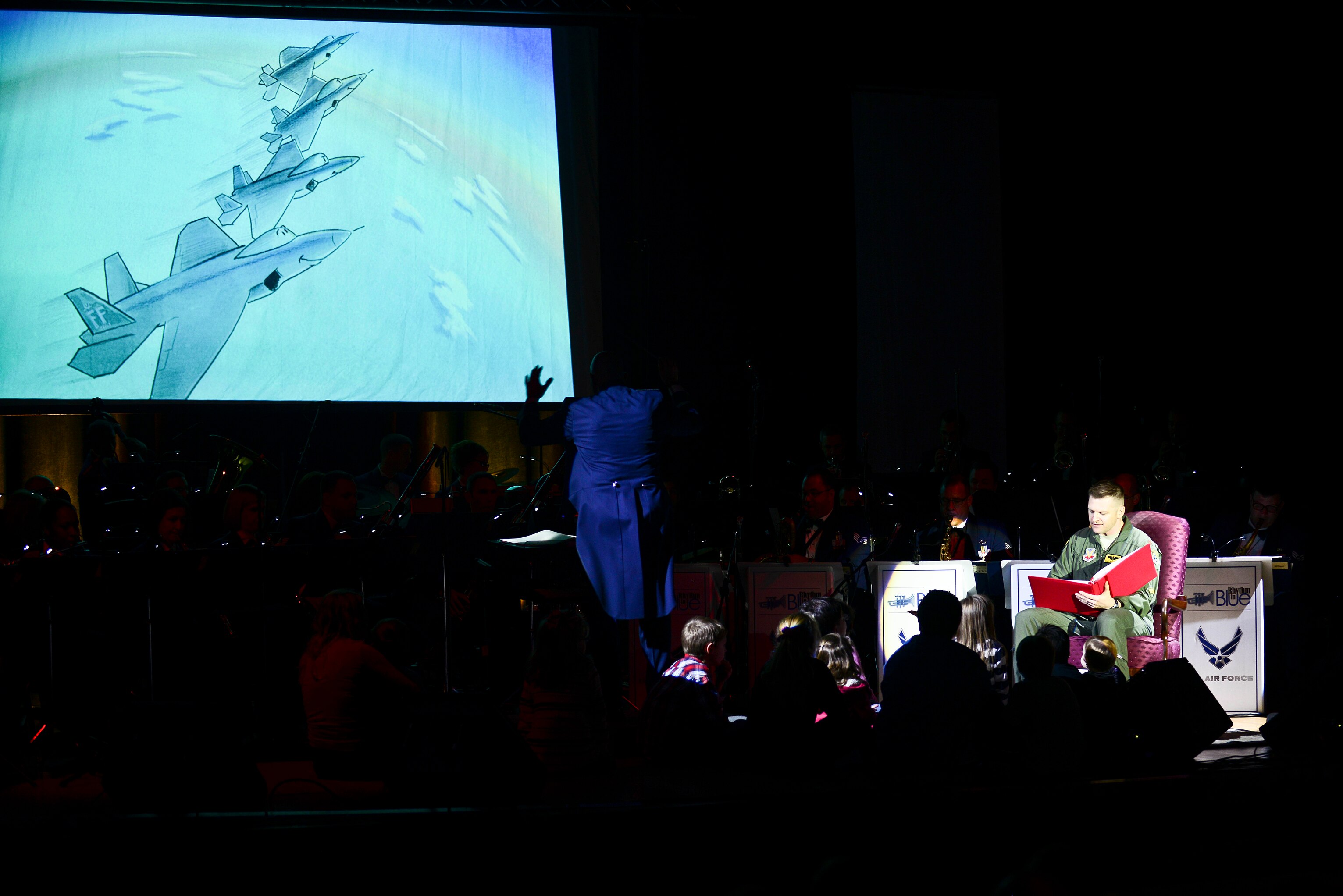 U.S. Air Force Maj. Robert Burgon, 27th Fighter Squadron assistant director of operations and pilot, reads a book titled “Robbie the Raptor,” while the U.S. Air Force Heritage of America Band performs a musical adaptation of the story at their holiday concert, “Through Children’s Eyes,” at Jamestown High School in Williamsburg, Va., Dec. 2, 2014. During the reading, children from the crowd were encouraged to join Burgon on stage. (U.S. Air Force photo by Senior Airman Kimberly Nagle/Released)