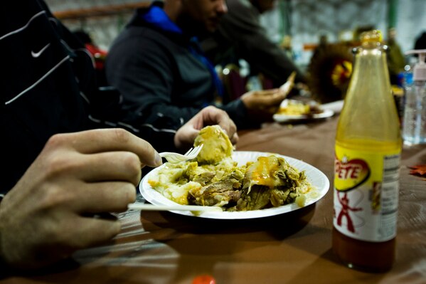 U.S. Service members eat Thanksgiving meals at the Langley Transit Center at Joint Base Langley-Eustis, Va., during their controlled monitoring period, Nov. 27, 2014. The members recently returned from Liberia supporting Operation United Assistance, a Department of Defense operation in Liberia to provide logistics, training and engineering support to U.S. Agency for International Development-led efforts to contain the Ebola virus outbreak in West Africa. (U.S. Air Force photo by Staff Sgt. Gustavo Gonzalez/Released)