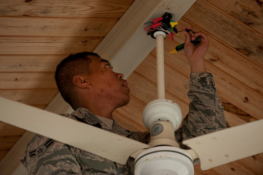Airman 1st Class Joshua Tomada, 633rd Civil Engineer Squadron electrician, installs celling fans at the Langley Transit Center recreation pavilion at Langley Air Force Base, Va., Nov. 6, 2014. Service members returning from West Africa with no known exposure to the Ebola Virus Disease will stay at the LTC for 21 days of controlled monitoring prior to returning to their home stations. During this 21-day period, Service members will be isolated from their families and the outside public, and medically monitored for any symptoms consistent with the Ebola Virus Disease. (U.S. Air Force photo by Staff Sgt. Natasha Stannard/Released)
