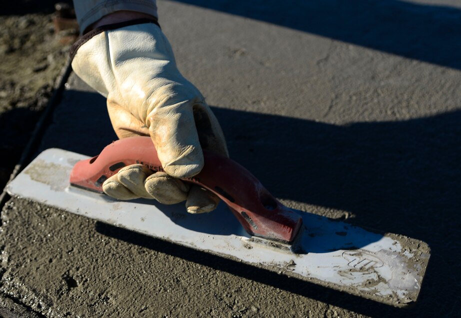A U.S. Air Force Airman assigned to the 633rd Civil Engineer Squadron flattens concrete for the new F-15 Eagle static display at Langley Air Force Base, Va., Oct. 17, 2014. The 1st Fighter Wing Association funded the project, which gave Langley Airmen a chance to train on skills they need in deployed locations. (U.S. Air Force photo by Senior Airman Austin Harvill/Released)