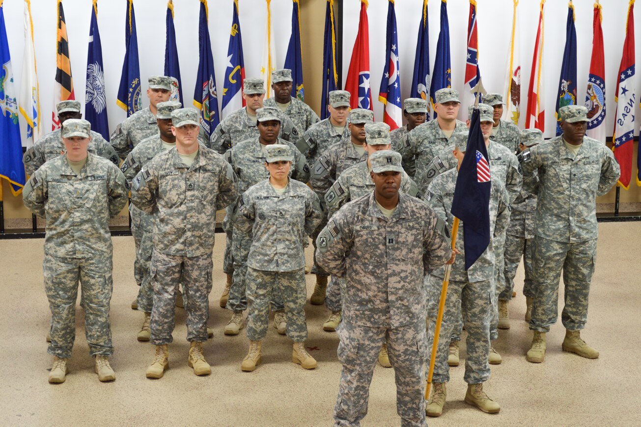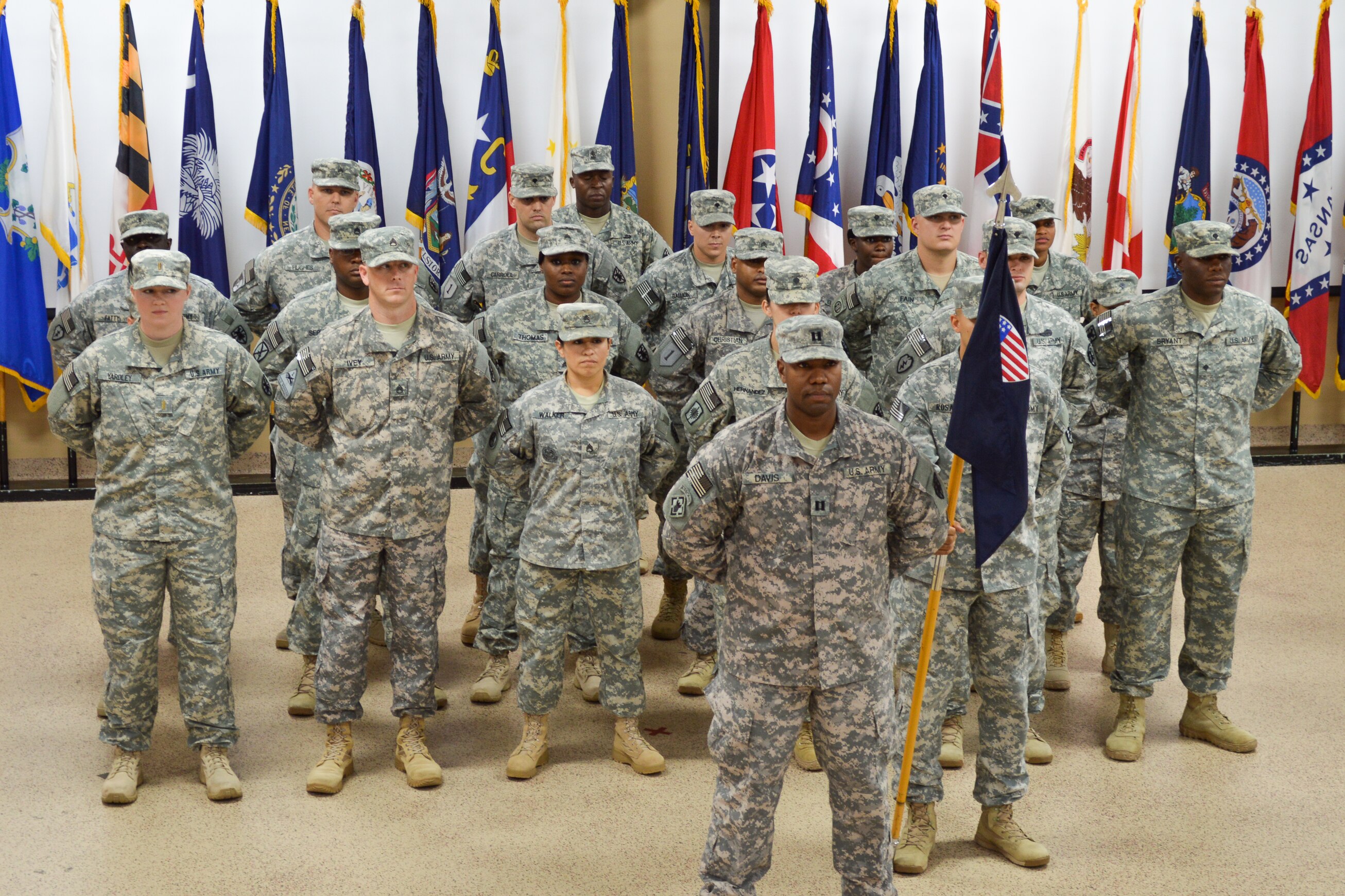 U.S. Army Soldiers assigned to the 510th Human Resource Company, 53rd Transportation Battalion (Movement Control), 7th Transportation Brigade (Expeditionary), stand in formation during a deployment ceremony at Fort Eustis, Va., Sept. 20, 2014. The team will be responsible for postal operations across four countries in the Middle East in support of Operation Enduring Freedom. (U.S. Army photo by Spc. Marian Alleva/Released)