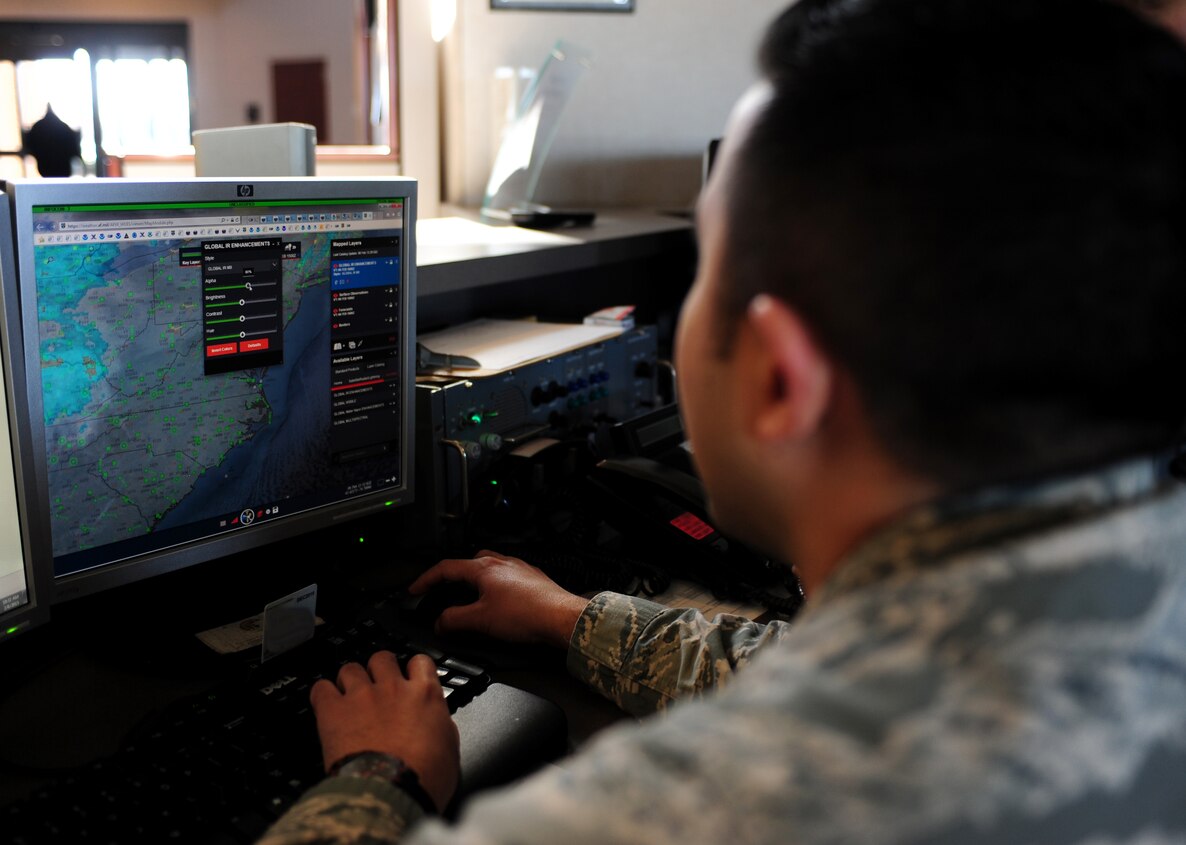 U.S. Air Force Staff Sgt. Adam Ybarra, 1st Operations Support Squadron weather forecaster, analyzes surface observations ahead of an oncoming low pressure system at Langley Air Force Base, Va., Feb. 6, 2015. To help ensure the safety of the base’s population, weather personnel prepare forecasts and issue up-to-date weather warnings during hazardous conditions. (U.S. Air Force photo by Airman 1st Class Areca T. Wilson/Released)