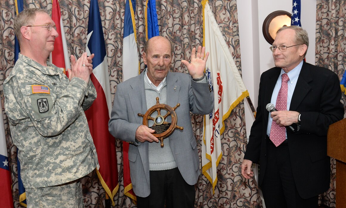 U.S. Army Chaplain [Lt. Col.] Jim King, Fort Eustis garrison chaplain, left, and Keith Morrow, 733rd Mission Support Group deputy commander, right, present a gift to Retired U.S. Air Force Lt. Col. Donald “Digger” Odell during the National Prayer Breakfast at Fort Eustis, Va., March 26, 2015. Odell spoke about the5 1/2 years he spent as a prisoner of war in Hanoi, North Vietnam, during the Vietnam War. (U.S. Air Force photo by Staff Sgt. Teresa J. Cleveland/Released)