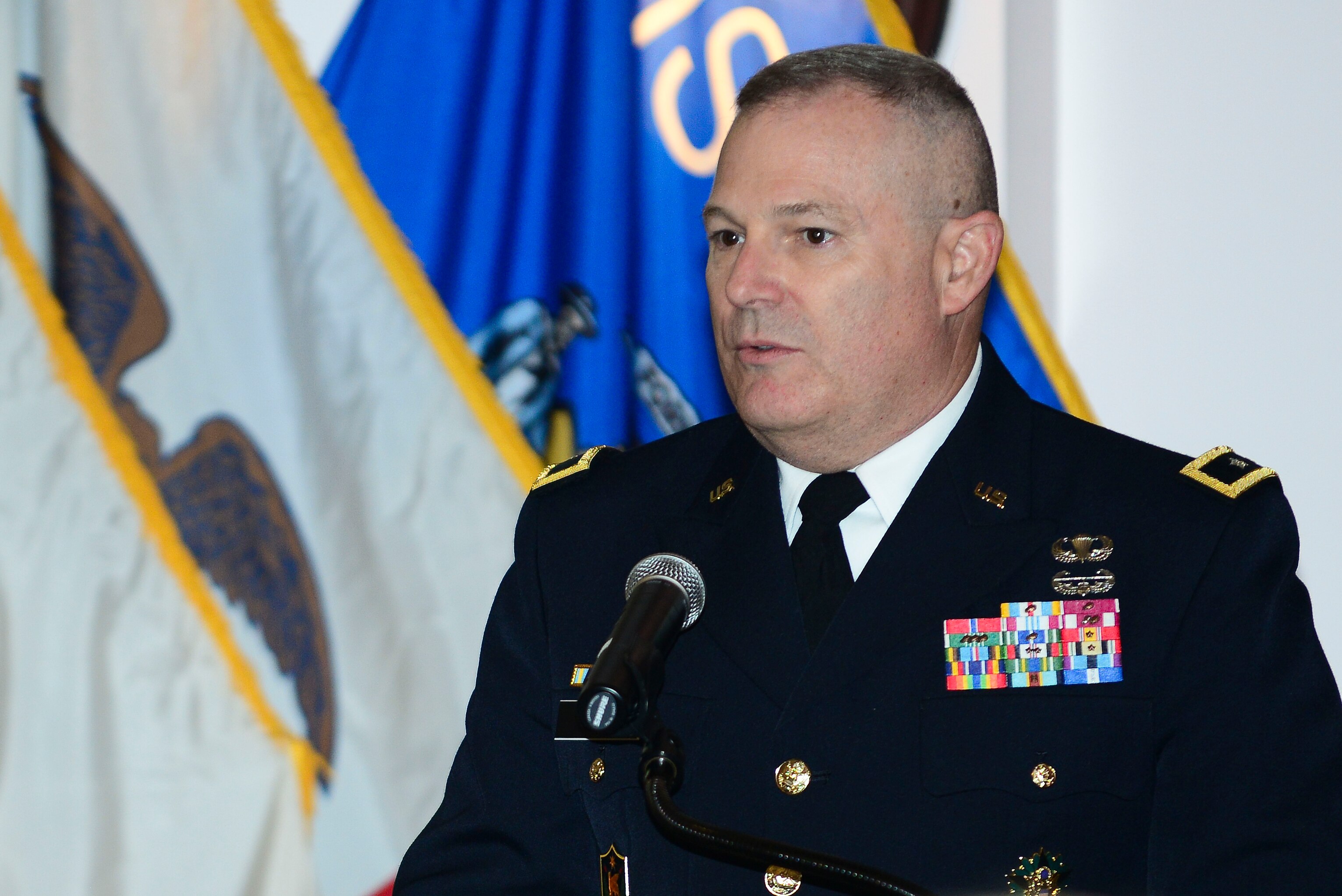 U.S. Army Maj. Gen. Ross E. Ridge, Initial Military Training Center, deputy commanding general, greets the crowd during the 50th Vietnam War Commemoration luncheon at Fort Eustis, Va., May 15, 2015. During his speech Ridge spoke about what an honor it was to be at an event that recognizes a special anniversary. (U.S. Air Force photo by Senior Airman Kimberly Nagle/Released)