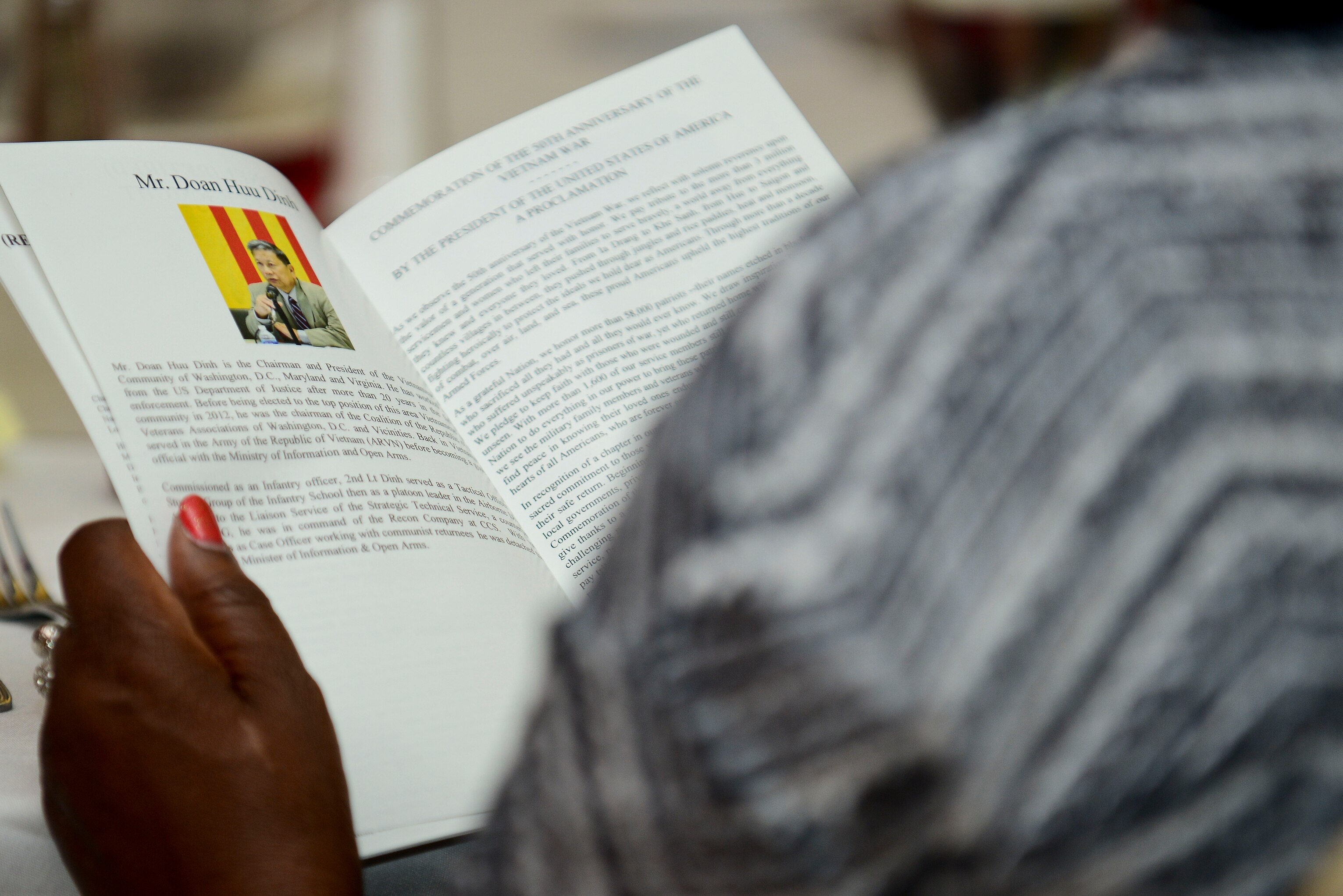 A 50th Vietnam War Commemoration luncheon attendee reads about a guest speaker at Fort Eustis, Va., May 15, 2015. There were full biographies for each of the guest speakers in the flyers passed out. The luncheon was used as a way to bring people together to honor and celebrate Vietnam Veterans. (U.S. Air Force photo by Senior Airman Kimberly Nagle/Released)
