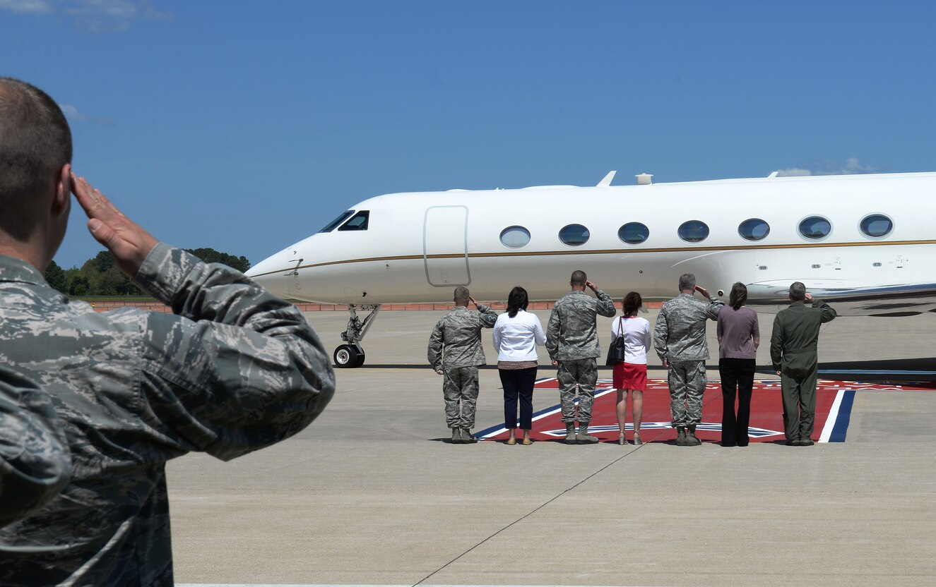 Airmen and leaders from Langley Air Force Base give a final salute as U.S. Air Force Chief of Staff Gen. Mark A. Welsh III, and his team leave Langley. During a three-day visit to Langley, Welsh and his wife, Betty, spoke with Airmen regarding issues in the Air Force that affect them now and may affect them in the future. (U.S. Air Force photo by Staff Sgt. Teresa J. Cleveland/Released)