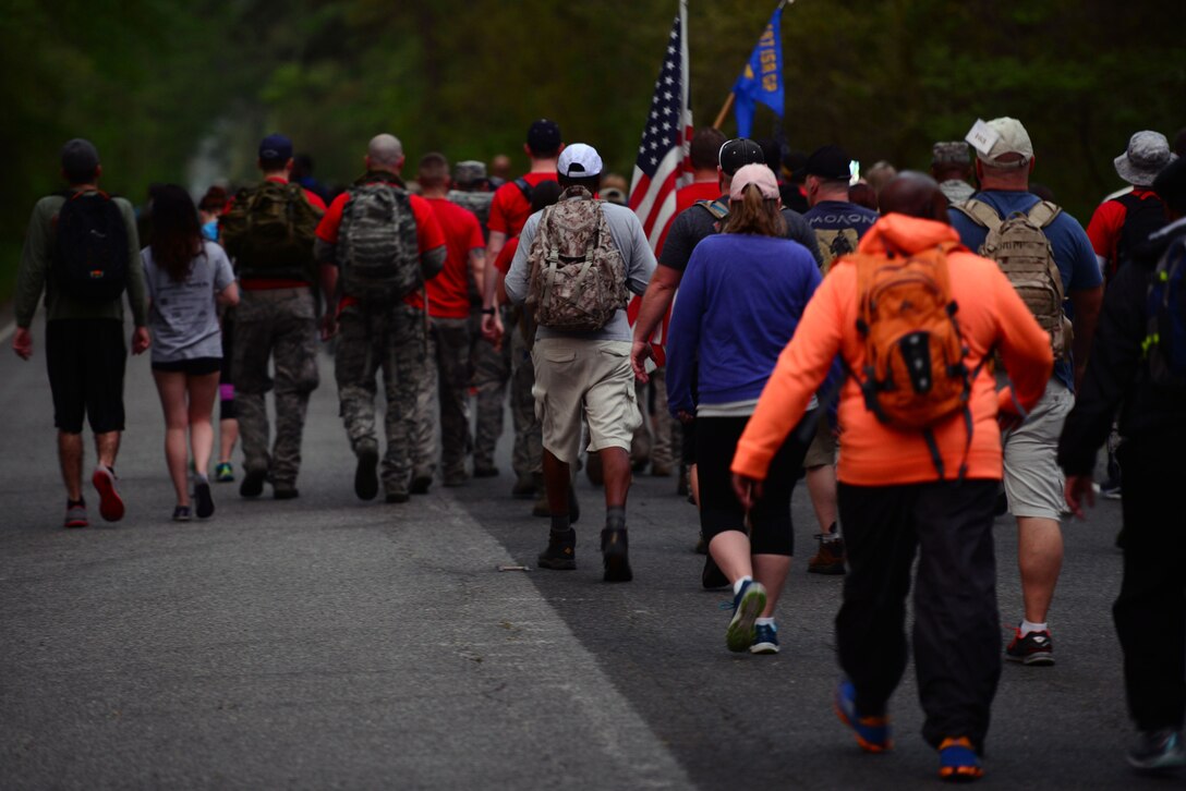 Participants begin a 16.6 mile walk to the North Carolina border as part of the Bataan Death March at the Great Dismal Swamp Trail in Chesapeake, Va., April 18, 2015. The walk honors those who were Prisoners of War and endured the original march in April 1942. (U.S. Air Force photo by Staff Sgt. Ciara Gosier)