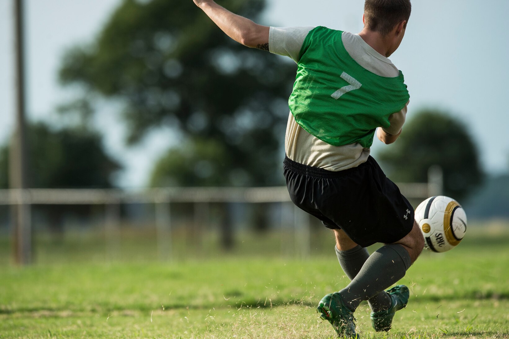 U.S. Air Force Senior Airman Shane Posey, 633rd Medical Group soccer team member, participates in the 2015 Intramural Soccer Championship game at Langley Air Force Base, Va., July 28, 2015. Players competed in front of base leadership, friends and family during the match. (U.S. Air Force photo by Senior Airman Kayla Newman/Released)