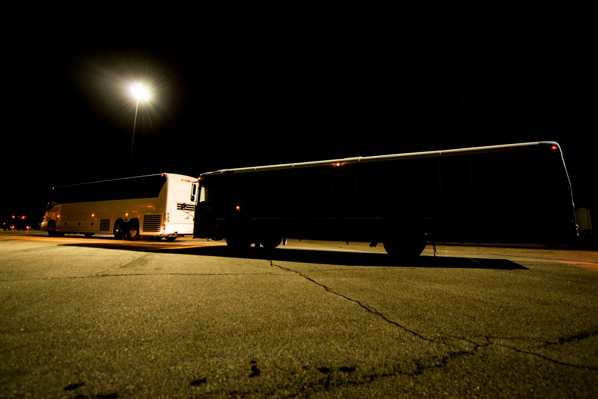 Buses transporting U.S. Air Force and Virginia Air National Guard Airmen returning from a deployment depart the flight line at Langley Air Force Base, Va., Oct. 5, 2015. During the six-month deployment, approximately 200 Service members from the 94th and 149th Fighter Squadrons provided support and stability to various regions under Operation Inherent Resolve. (U.S. Air Force photo by Senior Airman Kayla Newman/Released)