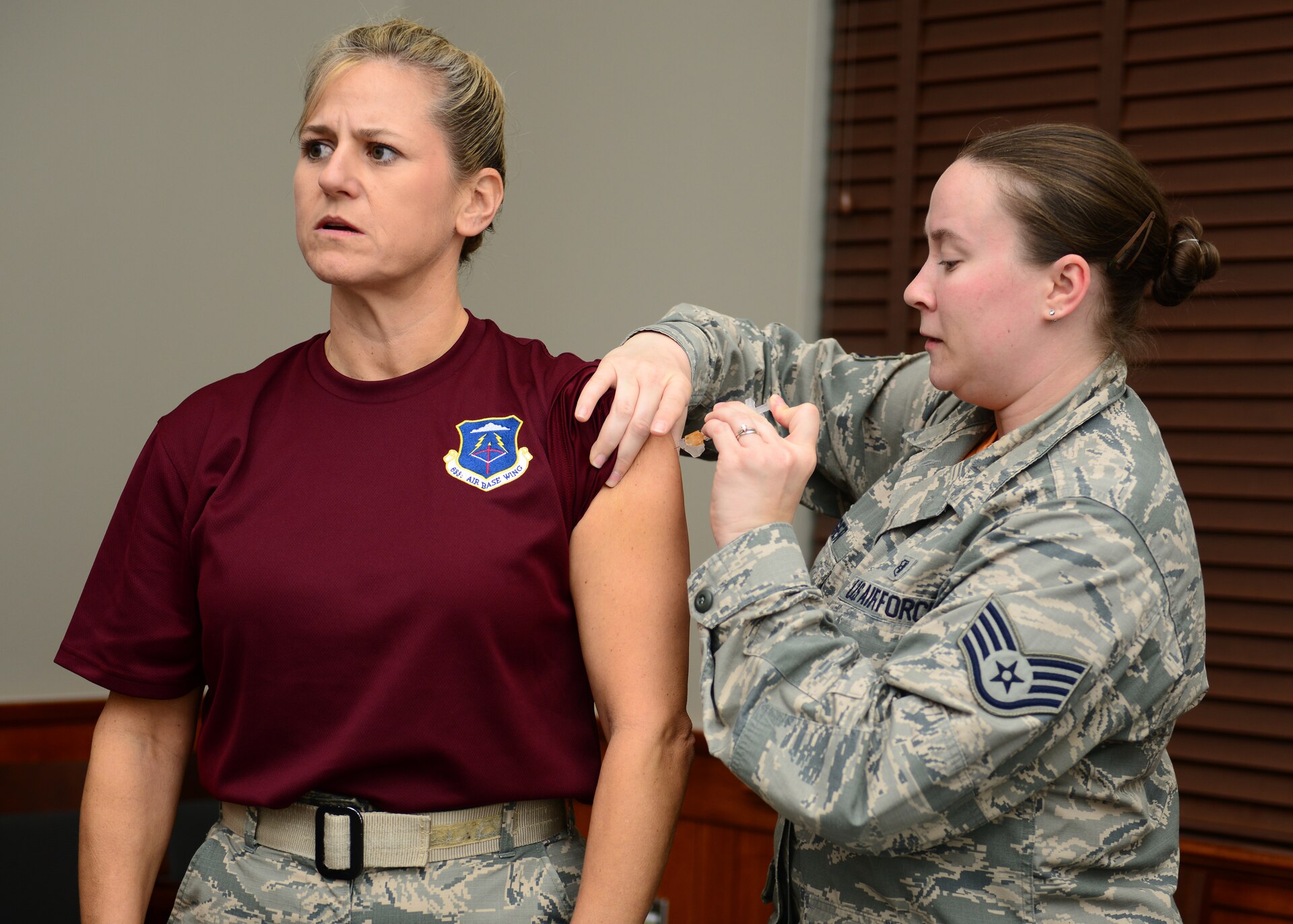 U.S. Air Force Col. Caroline Miller, 633rd Air Base Wing commander, receives her annual flu shot from Staff Sgt. Julianne Wenger, 633rd Medical Operations Squadron, at Langley Air Force Base, Va., Oct. 16, 2015. Flu vaccinations are set to be available for active duty Service members, government employees and first responders Oct. 21-22 from 7 a.m., until 5 p.m., at the Community Commons. (U.S. Air Force photo by Staff Sgt. Ciara Gosier/Released)