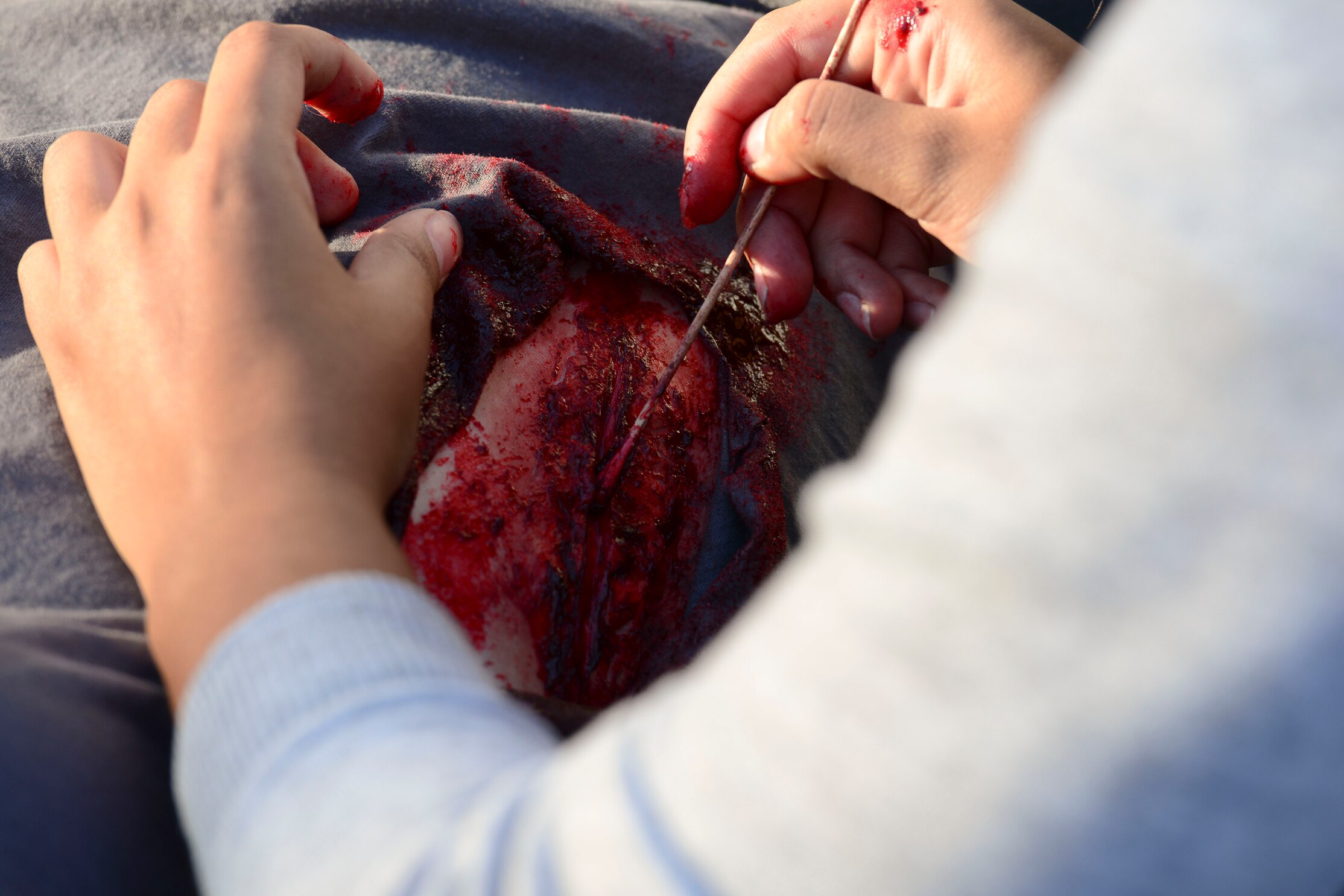 U.S. Air Force Senior Airman Gloria Alqubaisi, 633rd Medical Group medical technician, perfects a moulage application on an exercise victim during a medical mass casualty exercise at Langley Air Force Base, Va., Oct. 15, 2015. Volunteers are applied moulage to simulate injuries for medical Airmen participating. (U.S. Air Force photo by Staff Sgt. Ciara Gosier/Released)