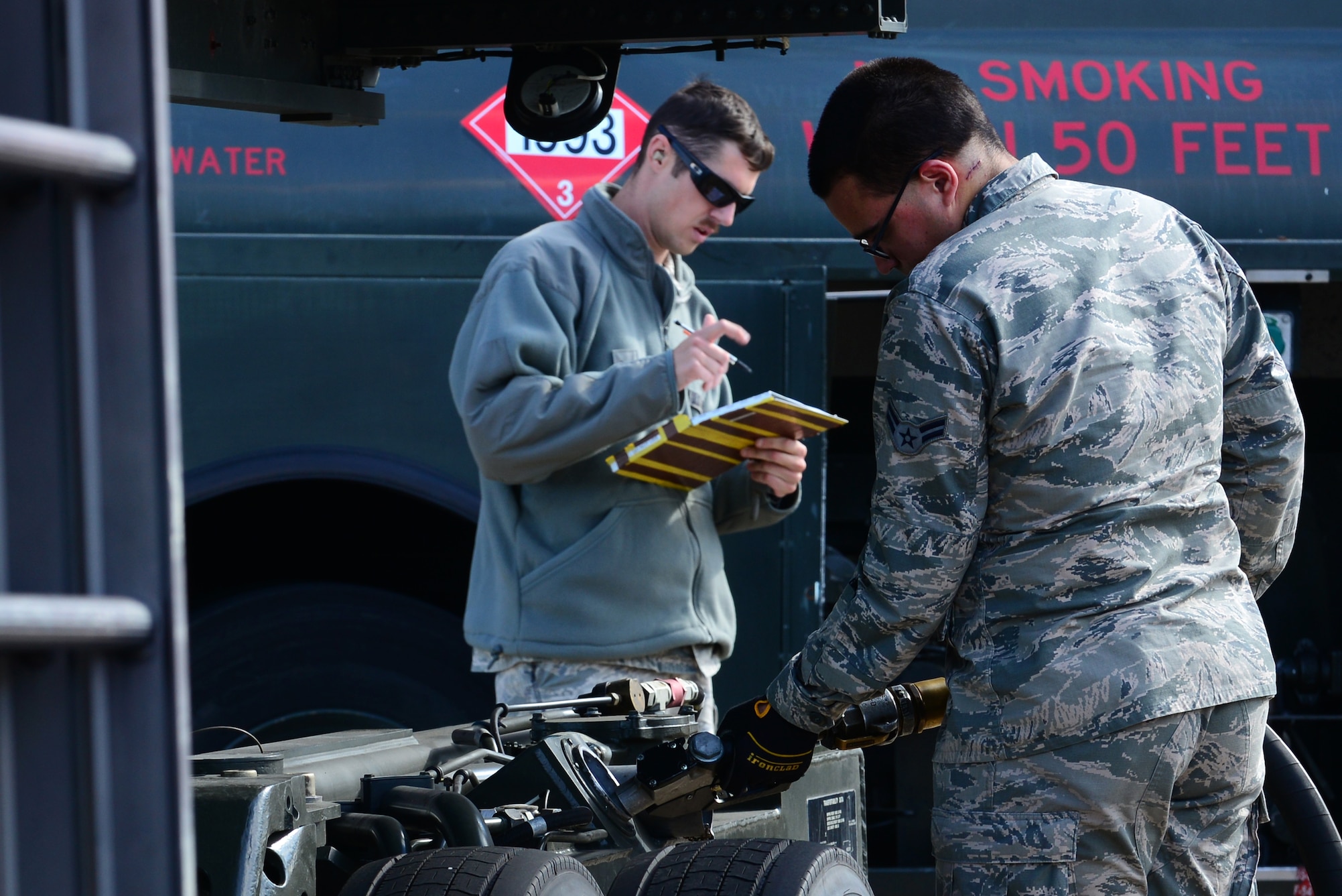 U.S. Air Force Senior Airman, Travis Grohman, 633rd Logistics Readiness Squadron fuels distributor, evaluates Airman 1st Class Joseph Quiros, 633rd LRS air transportation apprentice, as he fuels a K-Loader at Langley Air Force Base, Va., Oct. 19, 2015. In addition to fueling K-Loaders, the Airmen fuel forklifts, tugs, generators and aircraft at Langley. (U.S. Air Force photo by Senior Airman Kimberly Nagle/ Released)