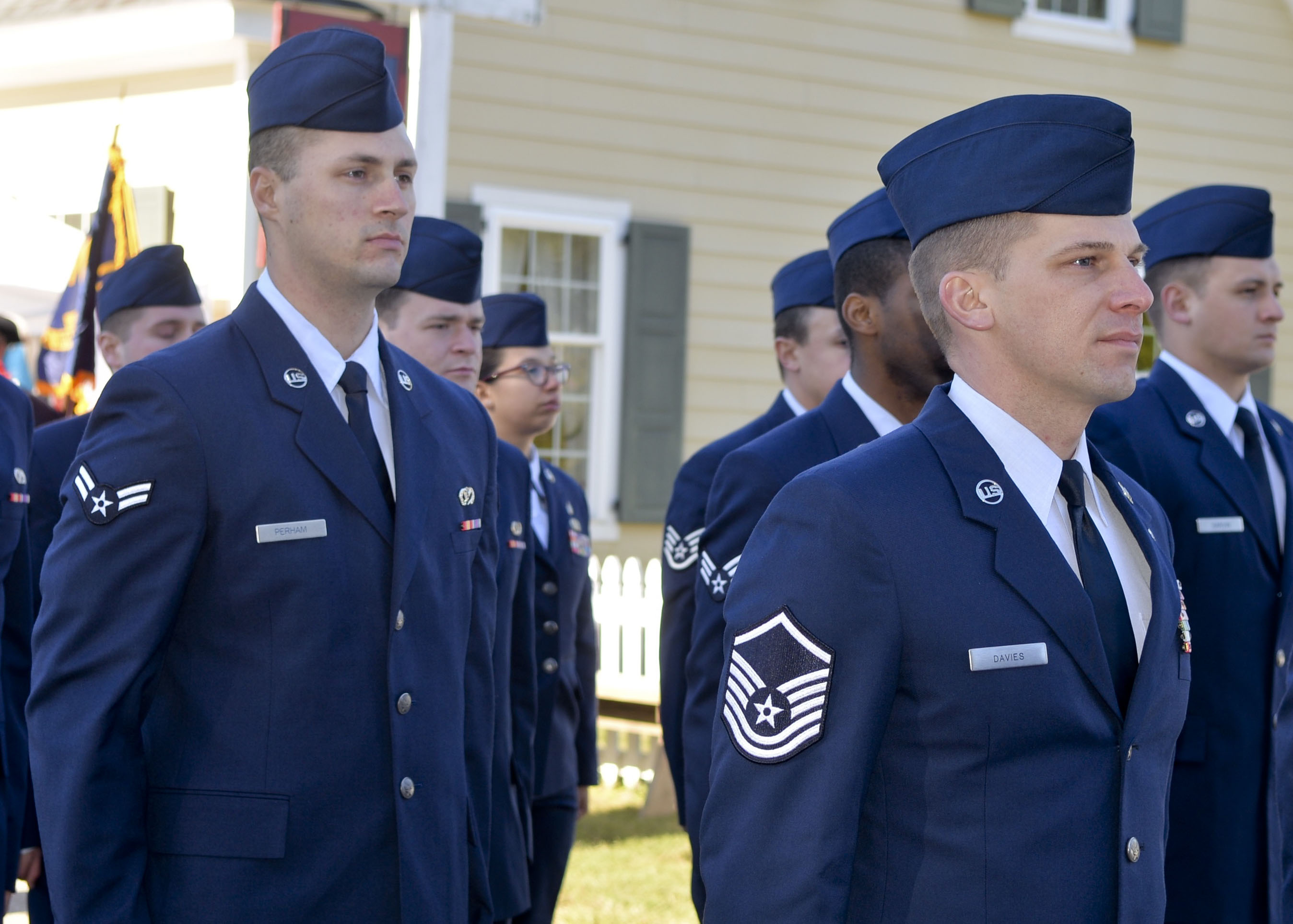 U.S. Air Force Airmen prepare to march in the Yorktown Day parade in Yorktown, Va., Oct. 19, 2015. U.S. Service members from Joint Base Langley-Eustis, Va., marched in the parade and participated in a patriotic exercise to commemorate the 234th anniversary of America’s Revolutionary War victory at Yorktown. (U.S. Air Force photo by 2nd Lt. Mahalia R. Frost /Released)